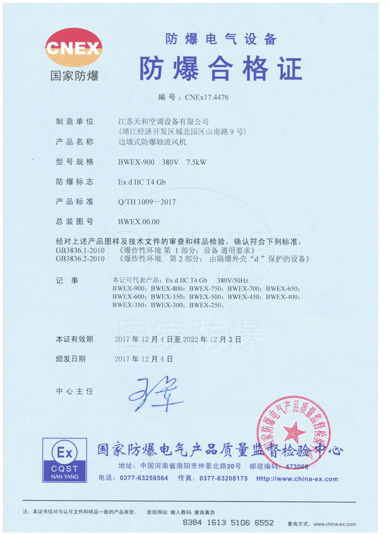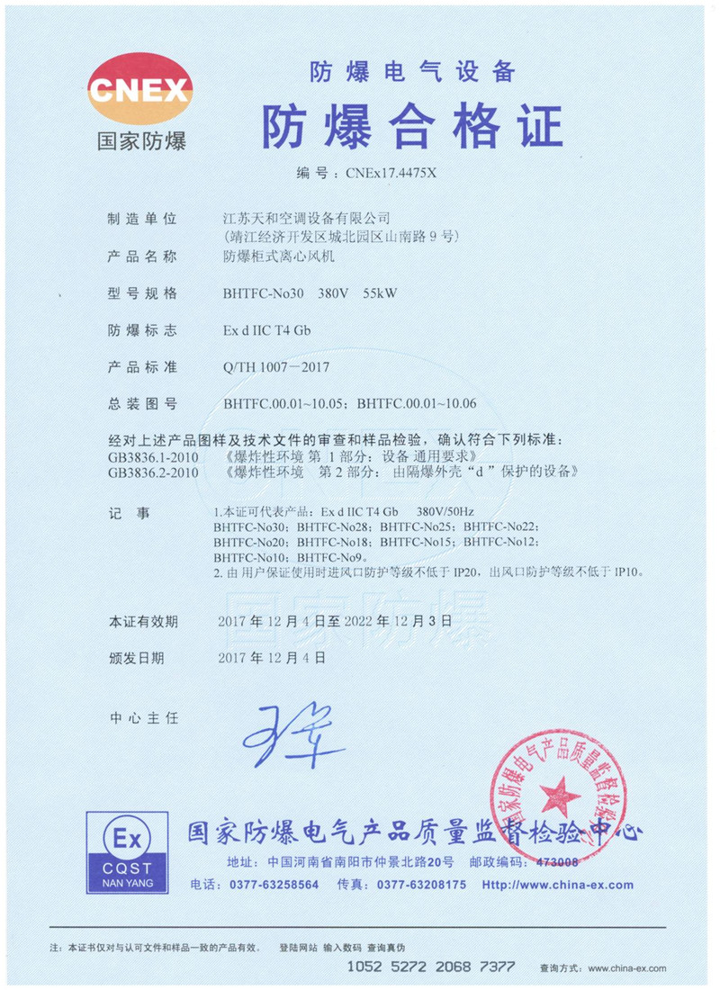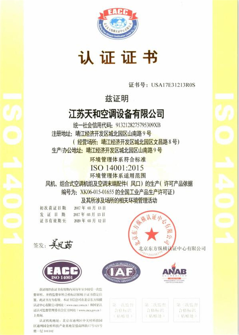 江苏天和空调设备有限公司生产的主要产品有组合式空气处理器、变风量空气处理机、消防高温排烟风机、消防高温柜式离心风机、全铝制屋顶风机、玻璃钢屋顶风机、商用(家用)PM2.5全热交换器、混流风机,斜流风机,离心管道风机,诱导风机及各种国标离心风机等通风设备、空调末端有消防3C防火阀,排烟防火阀,多叶排烟口,消声器、散流器、风口、调节阀等产品。其中消防产品已通过国家消防装备质量监督检验中心的检验,并可上国家公安消防网查阅检测结果。