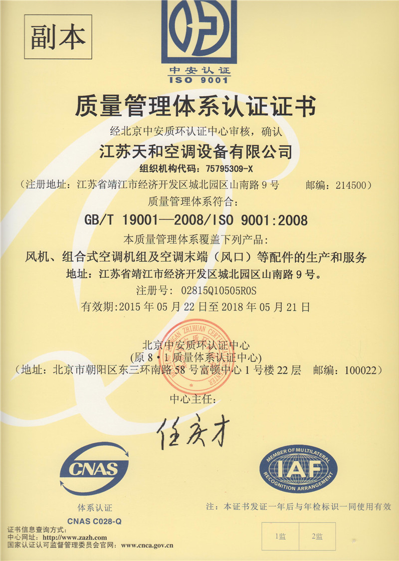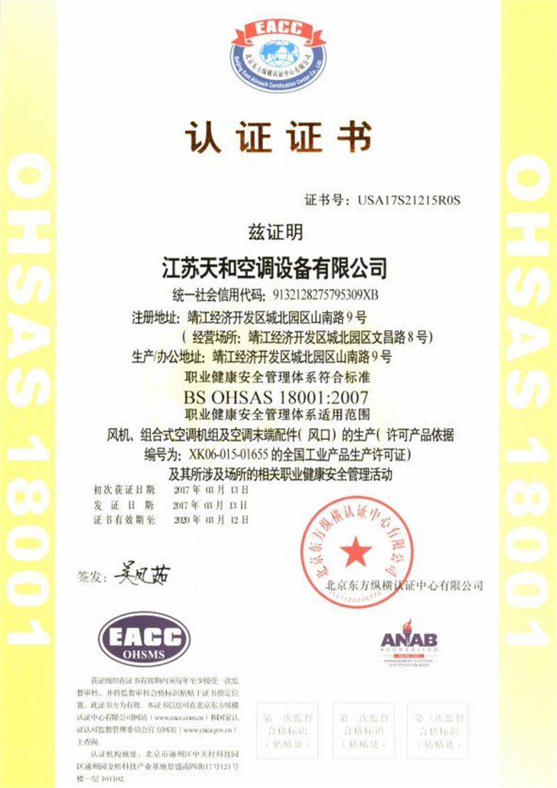 公司技术力量雄厚,生产设备先进,检测设备齐全,拥有自己的风机、空调、空调配件专业生产车间,并拥有专业设备80台套,专业技术人员120人,是江苏省消防协会会员单位,并通过了ISO9001-2000质量管理体系认证。